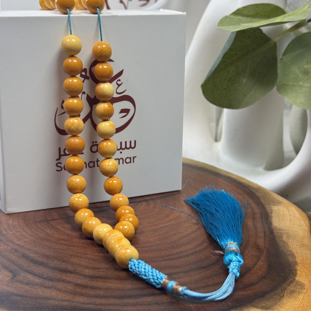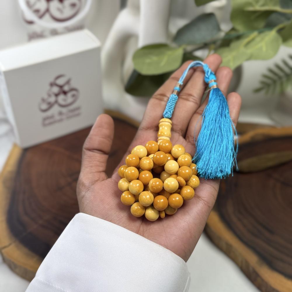 تتميز خرزات المسباح بملمسها الناعم، مما يجعلها مريحة عند الإمساك بها. كما أن الخرزات مصنوعة من مواد عالية الجودة تضمن متانة المنتج ودوام استخدامه لفترة طويلة. التصميم الدائري للخرزات مع حواف ناعمة يضفي طابعًا أنيقًا وعصريًا، مما يجعل هذا المسباح ليس مجرد أداة للذكر، بل قطعة فنية تزين اليد.