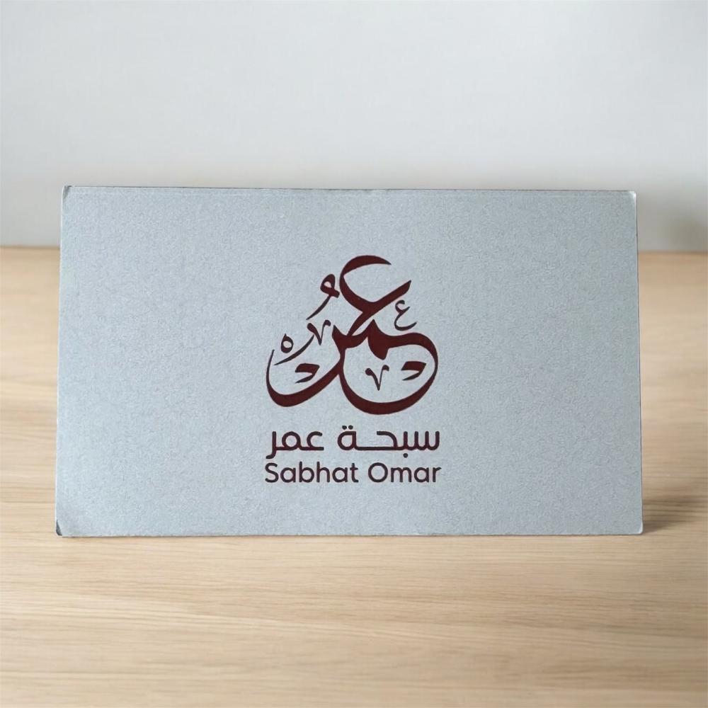 - الشعارات: يحمل الكرت شعار "سبحة عمر" بتصميم مميز، مما يضيف لمسة من الفخامة.